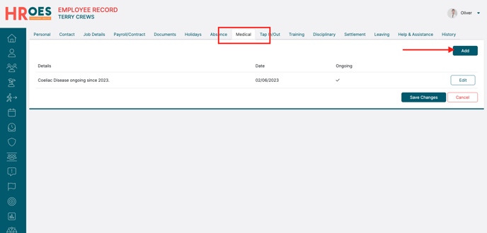 In the employee profile, click into the "Medical" tab across the top. In the resulting screen you will see all existing Medical Records, and also have the option to Add as highlighted below: