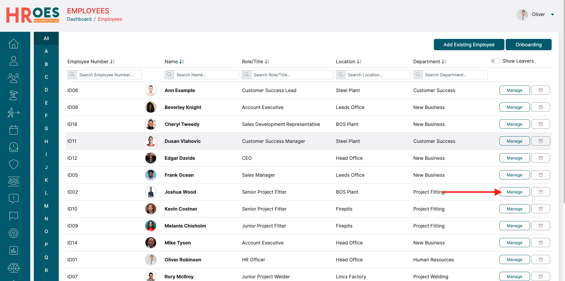 Alternatively, you can amend an employee's personal details by first clicking "Manage" beside the desired employee's name in your Employees tab: