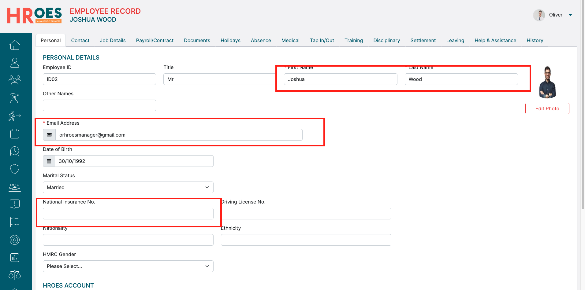 In the resulting tab, you will be presented with the employee's Personal details, where you can amend details such as Name, Email Address and also NI Number:
