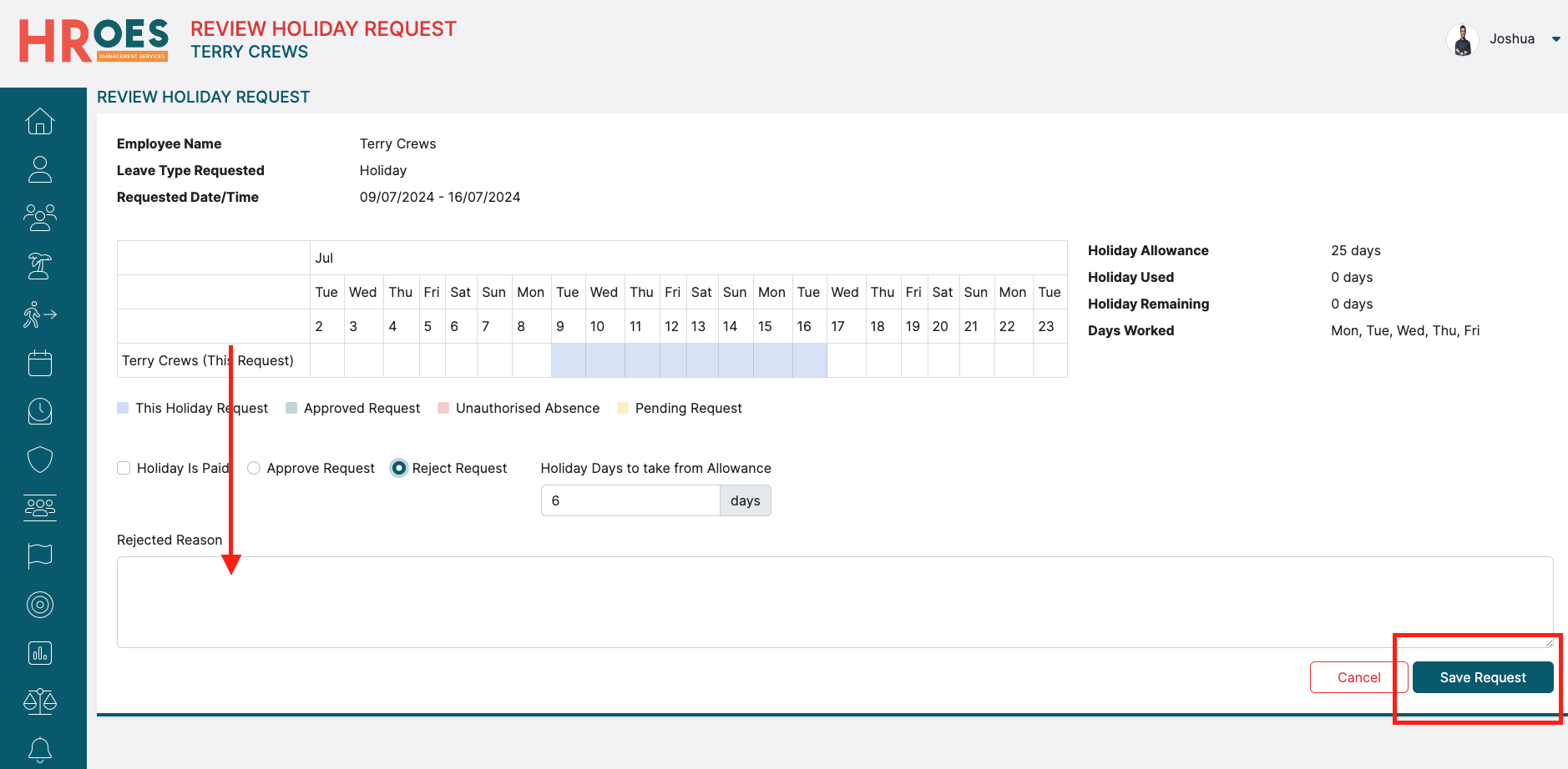 NOTE: The employee in question will have visibility of the rejection reason if you reject their holiday.