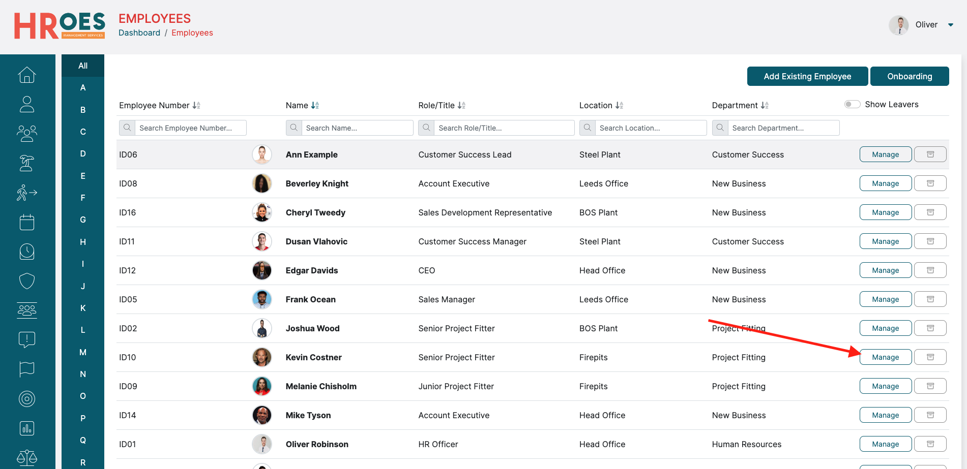 To calculate the Bradford Factor of a single employee, first go to your main Employees tab and select "Manage" next to your desired employee: