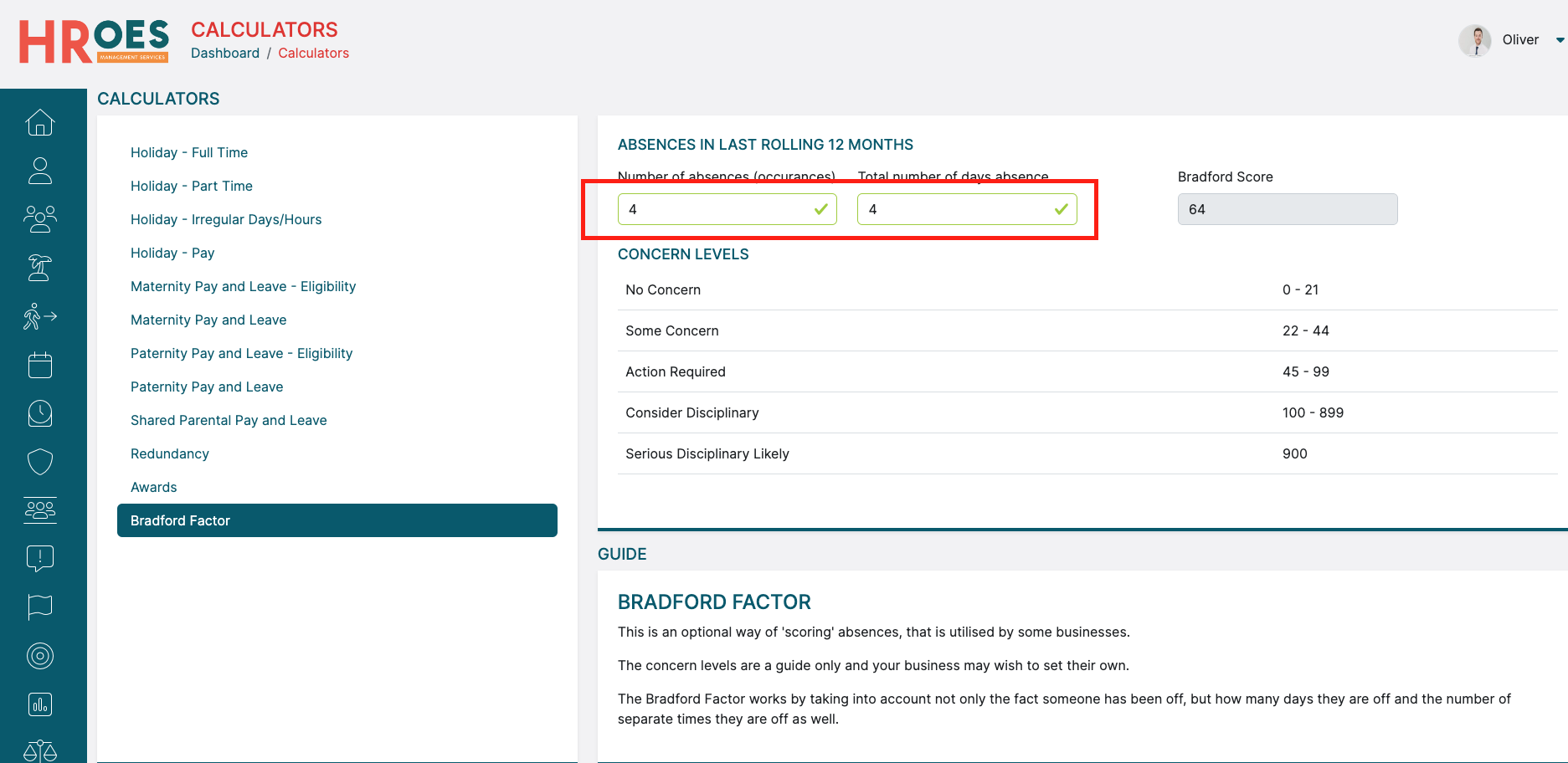 Once in the main Calculators tab, you can choose Bradford Factor and then manually enter the number of days and spells the employee has on their file: