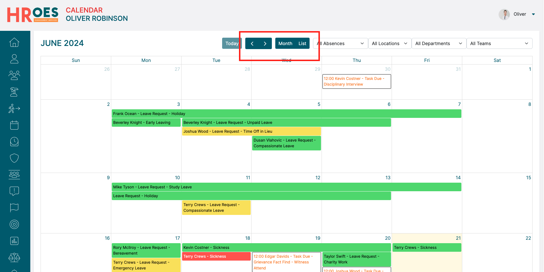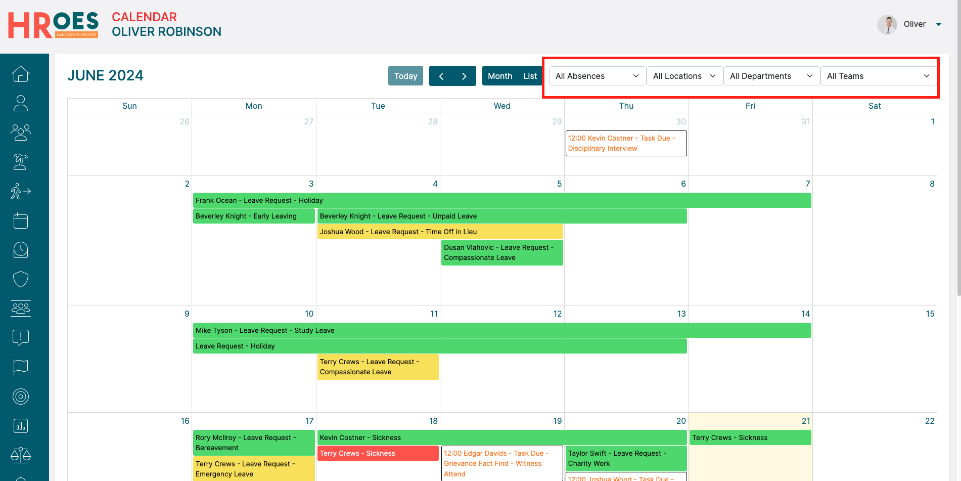 Alternatively, you can toggle data based on Absence Type, Location, Department and Team using the dropdown menus to the top-right of your calendar: