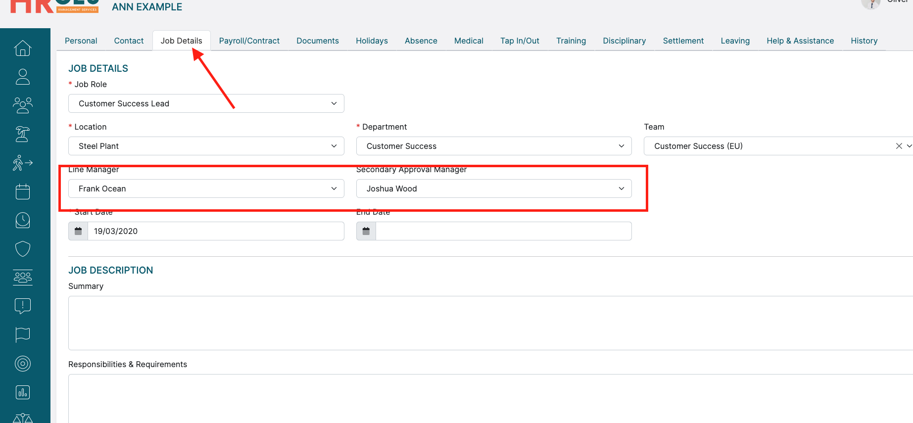 In this tab, around half-way down, you will see the data fields named "Line Manager" and "Secondary Approval Manager":