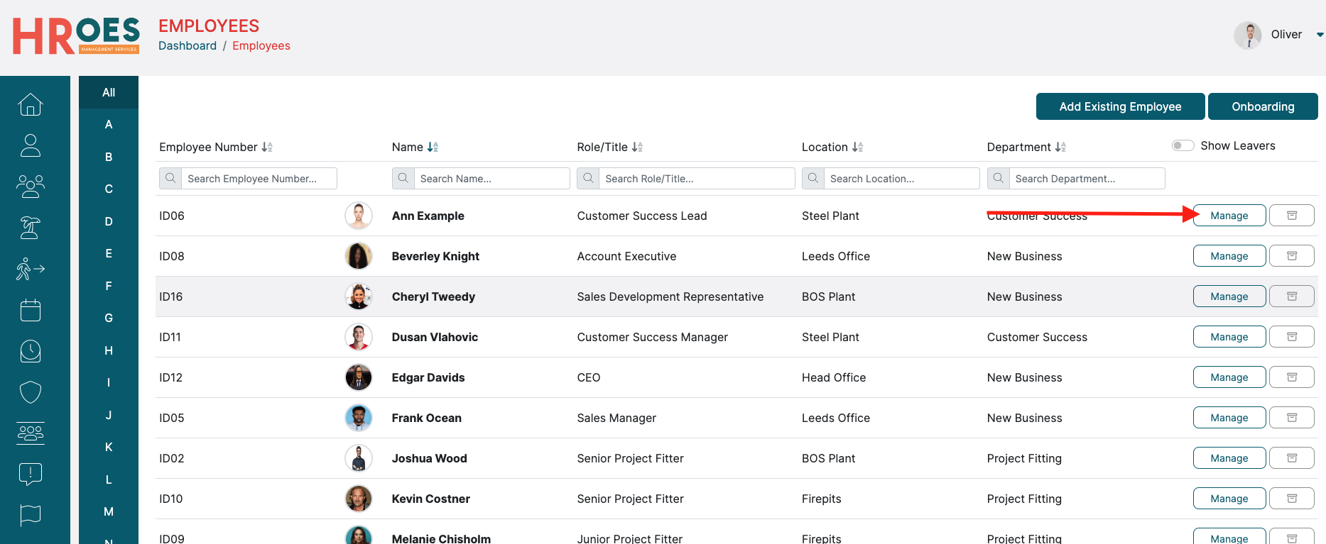 Alternatively, you can set an employee's manager by first clicking "Manage" in the Employees tab on the desired employee: