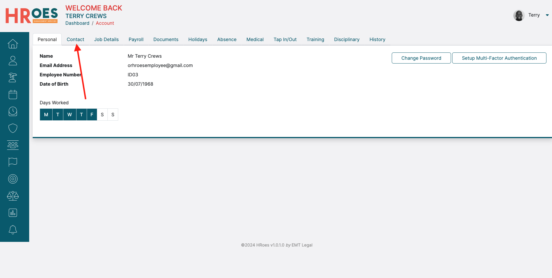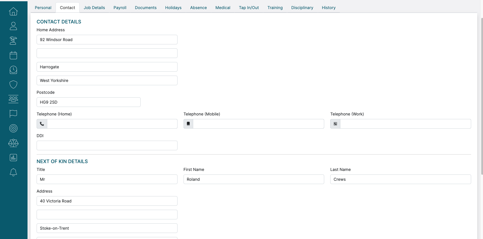 In the resulting "Contact" tab, you can amend your own Address and Telephone details, as well as your Next of Kin details: