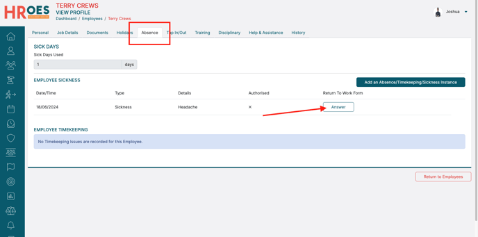 From here, click into the employee's "Absence" tab to display all sickness records. For any sicknesses that require a Return to Work, the option to "Answer" will appear to the right of that instance: