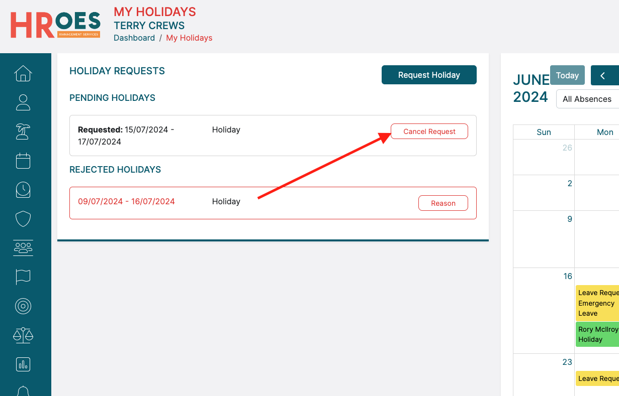 You can also cancel your Holiday by first going into the "My Holidays" tab, where your existing holiday requests will display: