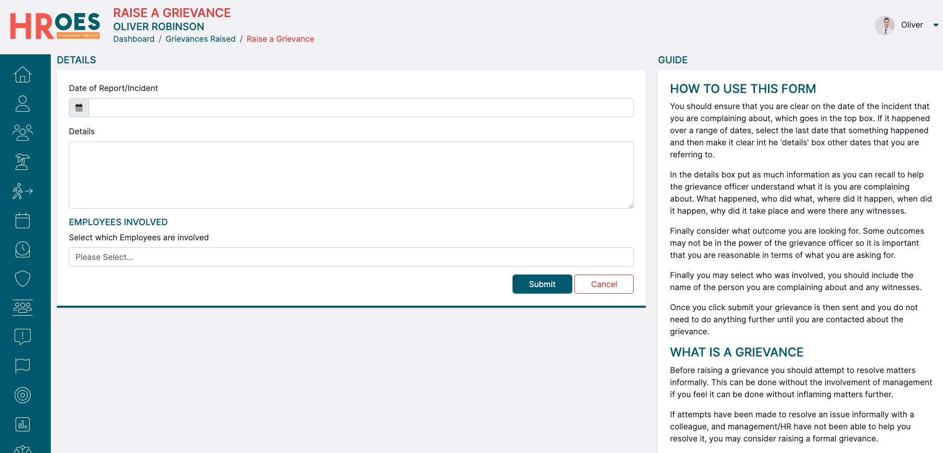 Once happy to proceed, click "Raise a Grievance". You can then add the date of the Grievance and add full details in the text box below. Finally, add the employees involved and click "Submit":