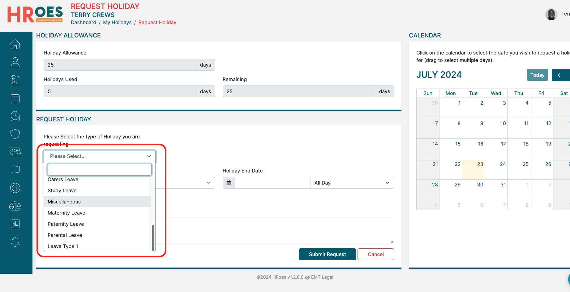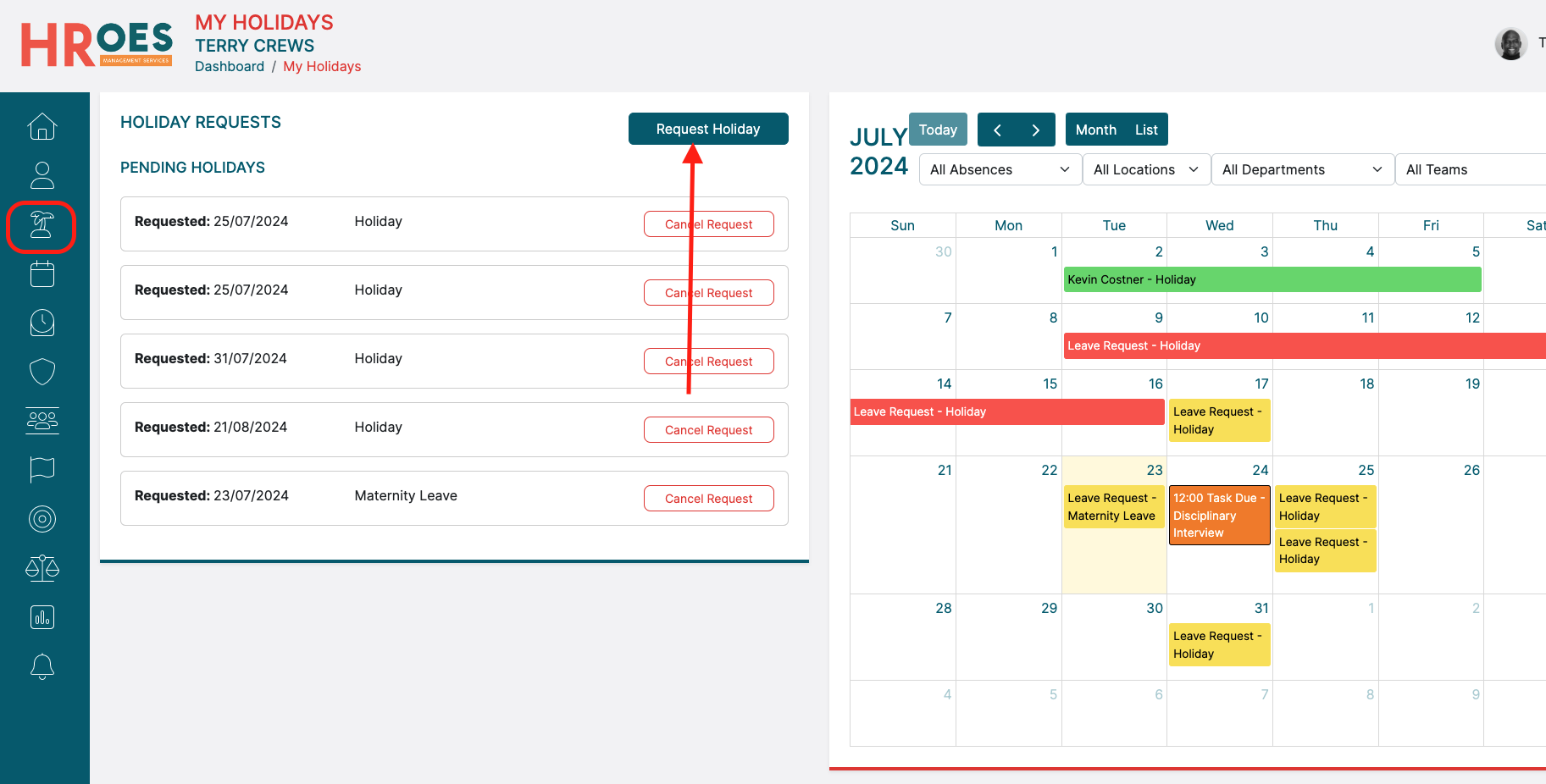 You can also add a Maternity or Paternity request by selecting "Book Holiday" from your dashboard, or by selecting "Request Holiday" within the "My Holidays" tab: