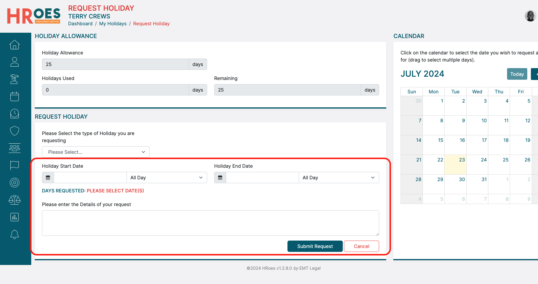 Once the type of leave is selected, just add the dates of your leave and any additional details in the text box at the bottom of the page: