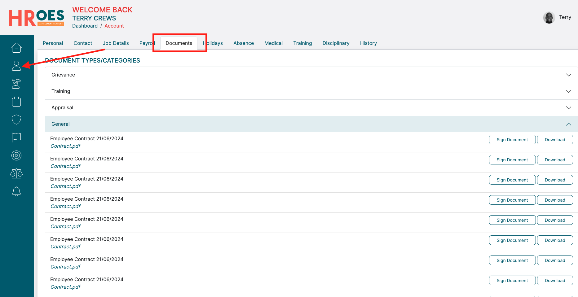 Alternatively, to sign your Contract, login to your HRoes account and head to the "My Account" tab, and then into your "Documents" section as shown here: