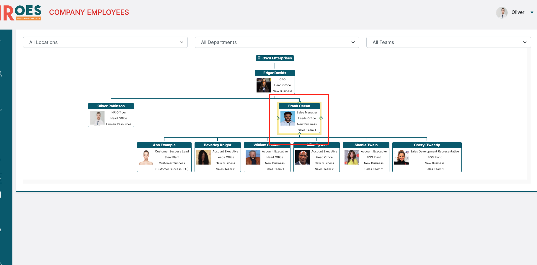 When you first enter the Employee Chart, you will be presented with your entire Company reporting lines as a default view: